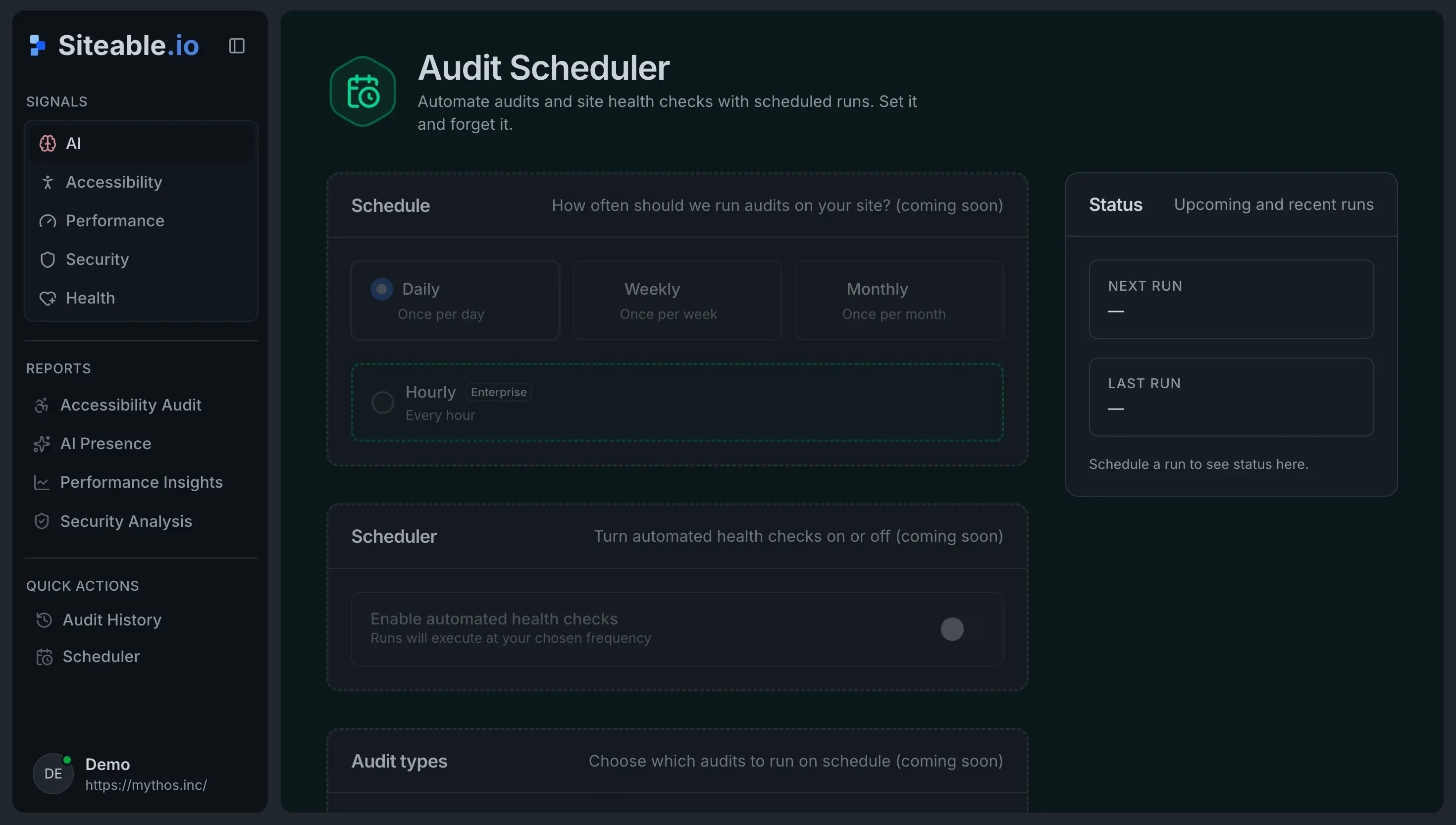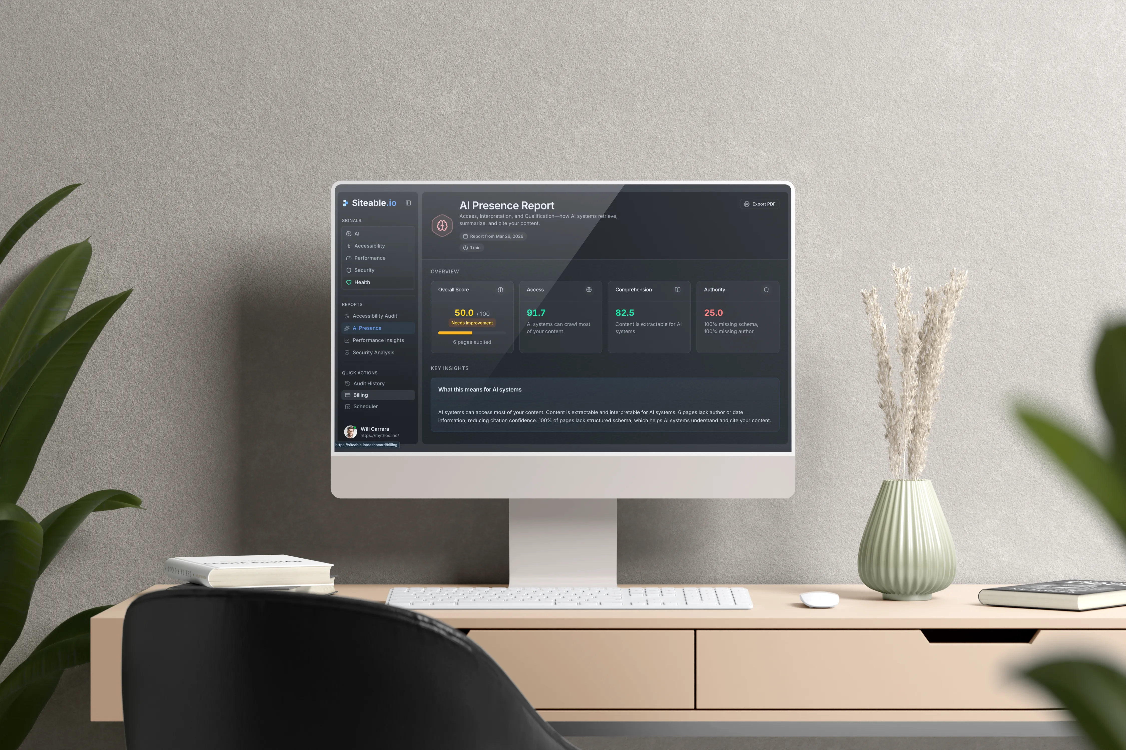 Siteable is an all-in-one website comprehension and audit system. It unifies accessibility, performance, security, structure, and AI visibility so teams can understand what is working, what is broken, and what to prioritize next.